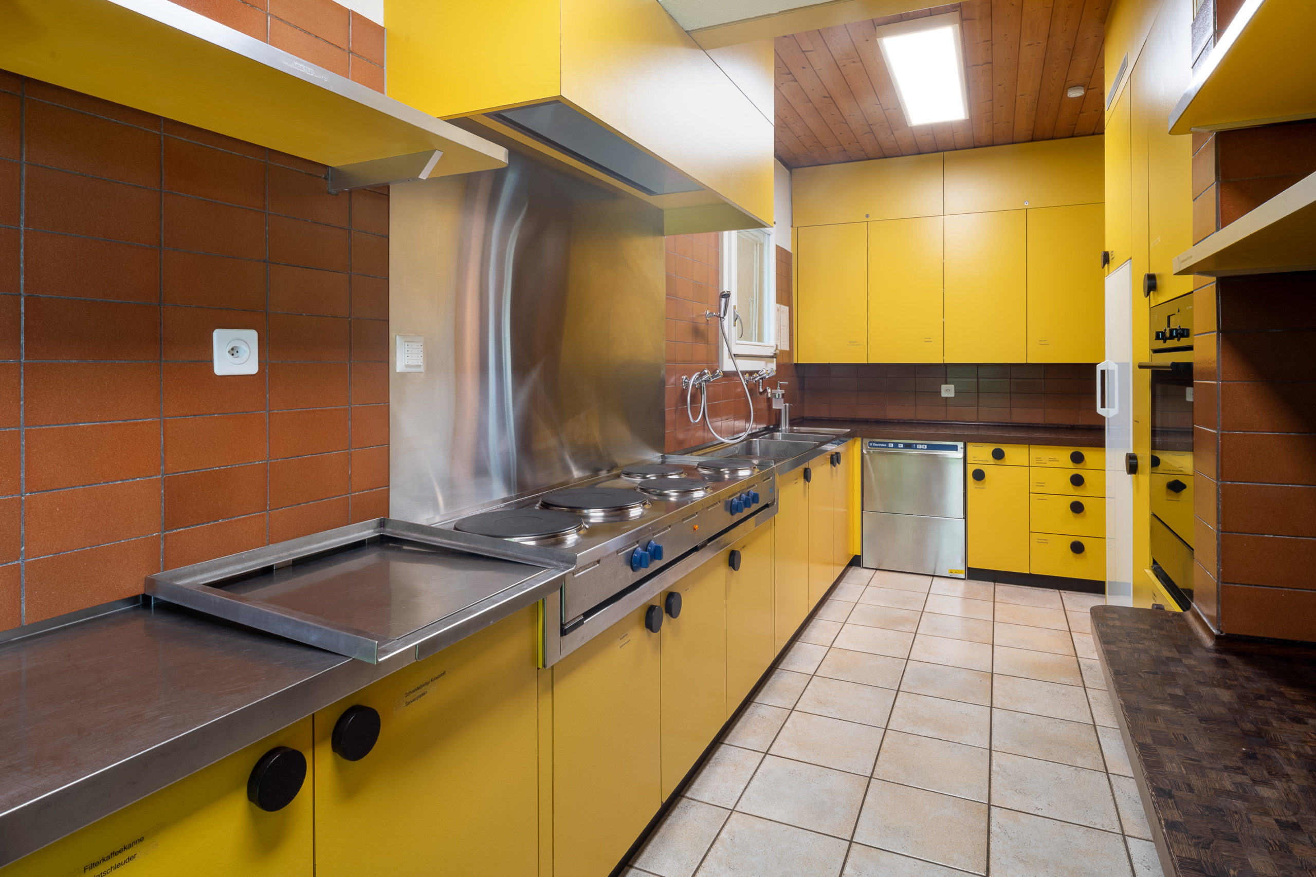 Die Küche ist mit einem elektrischen Herd mit 5 Kochplatten, einem Kühlschrank mit kleinem Gefrierfach 254l / 21l und einem Gastro-Geschirrspüler ausgestattet. Kochgeschirr und -geräte sind vorhanden.