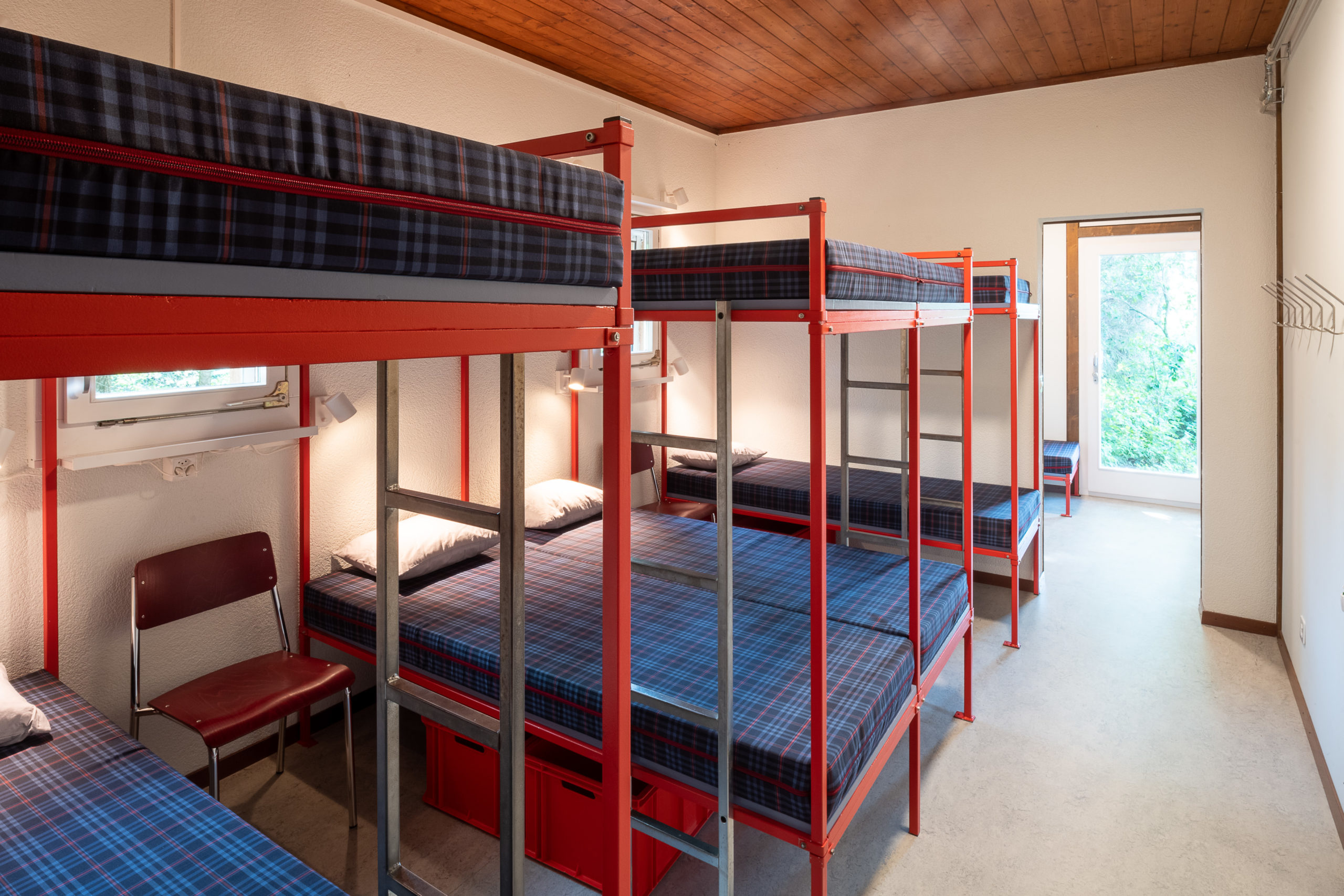 Die Schlafplätze sind aufgeteilt in drei 2er-, und ein 8er-Zimmer im Erdgeschoss und ein Massenlager mit 16 Plätzen im Dachgeschoss. Ein 2er-Zimmer im Erdgeschoss ist speziell für Rollstühle geeignet.