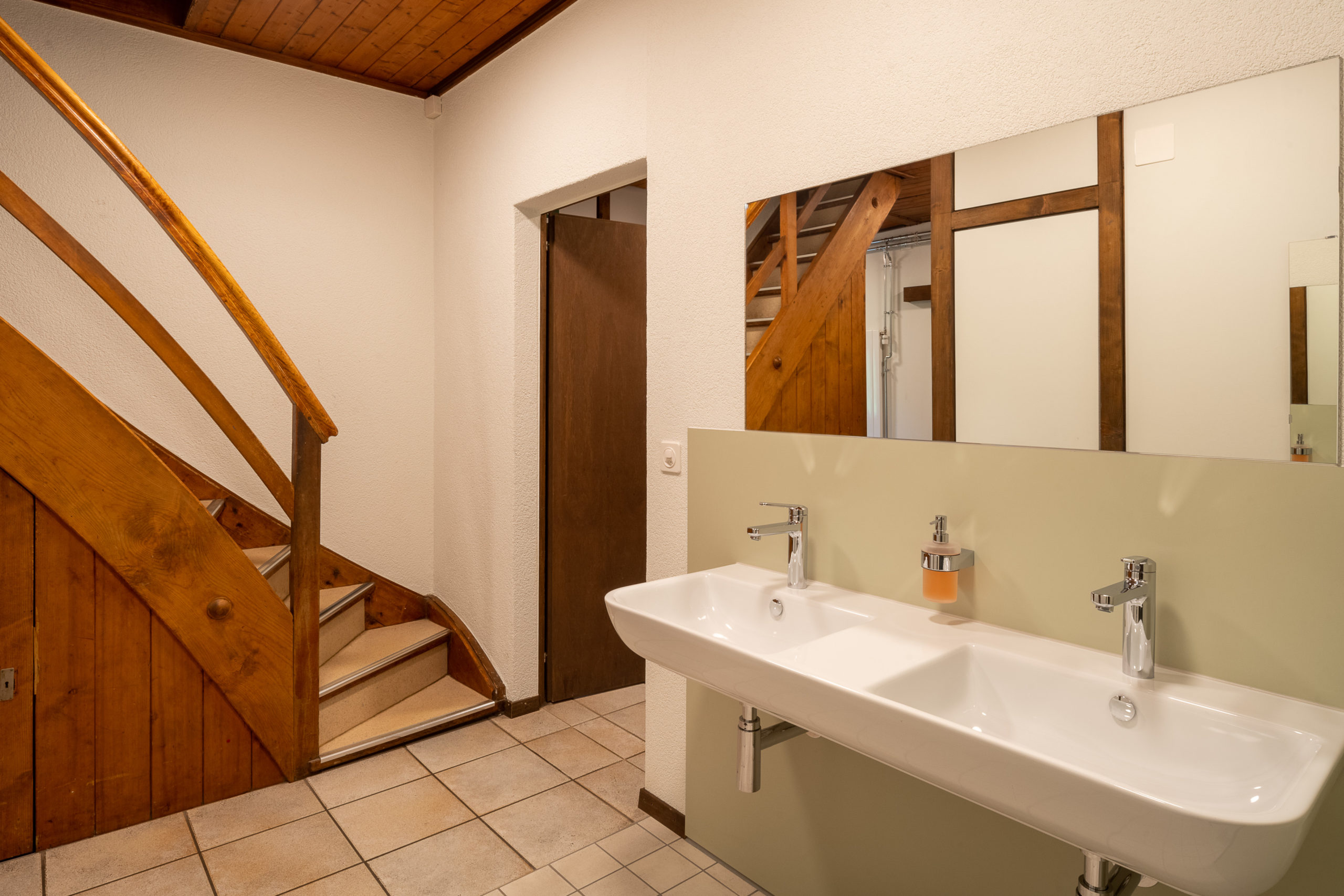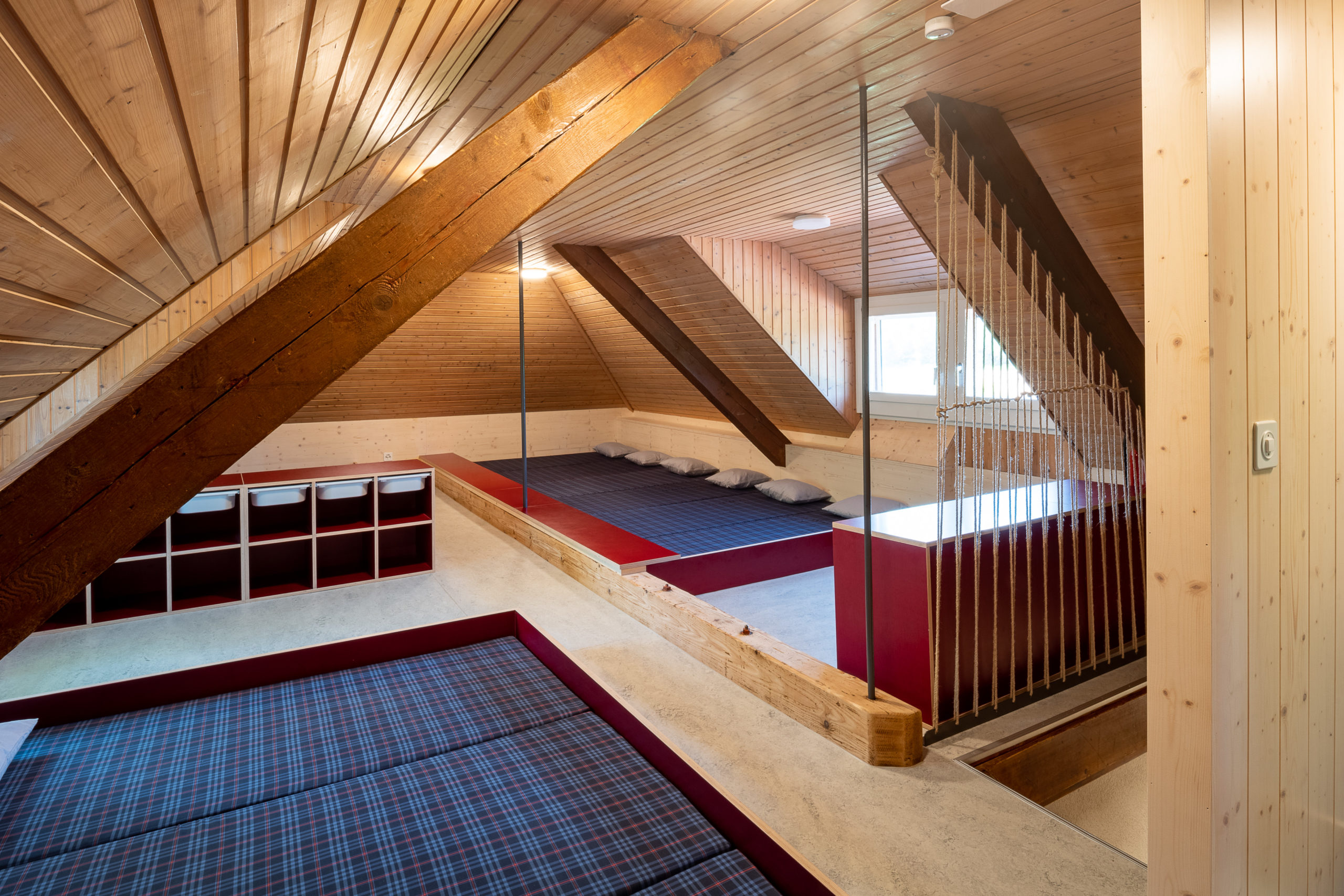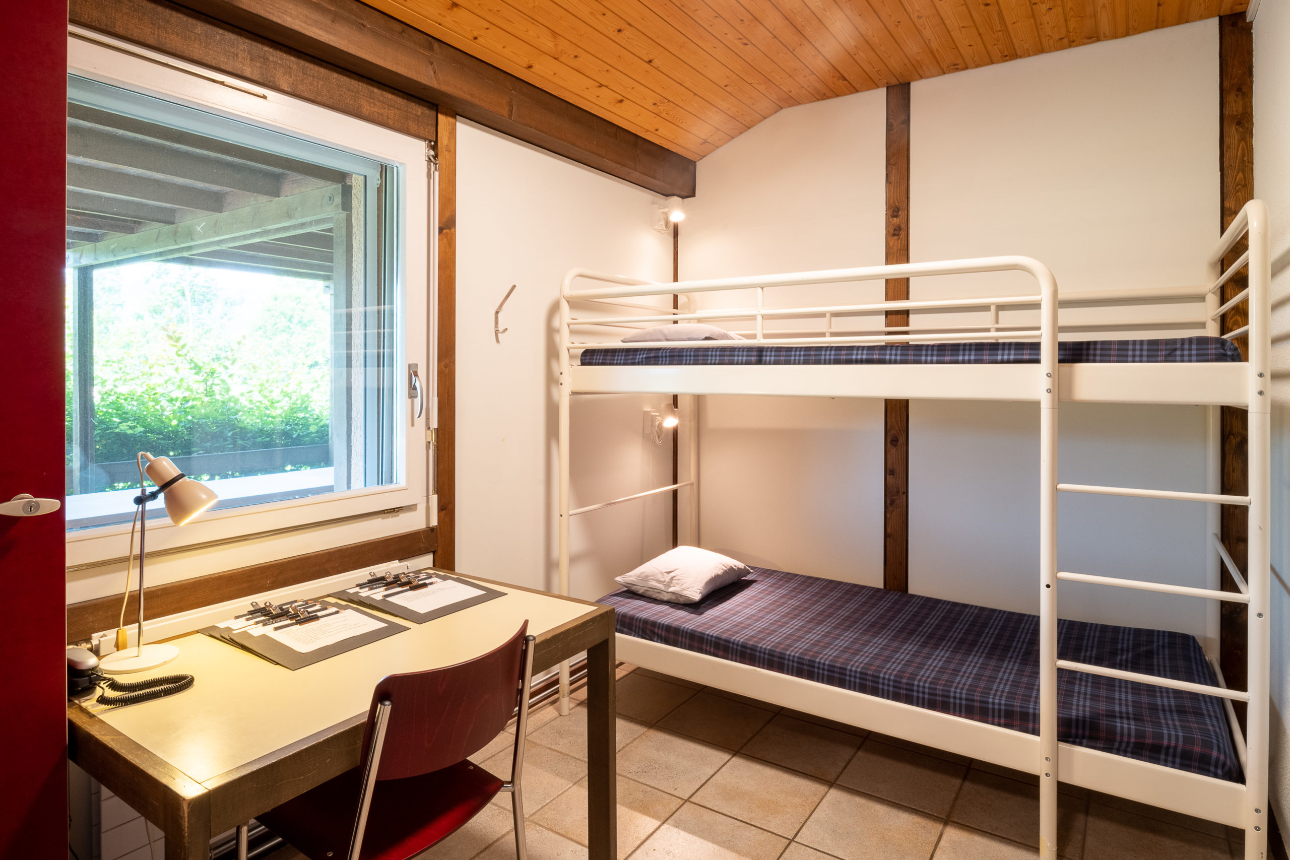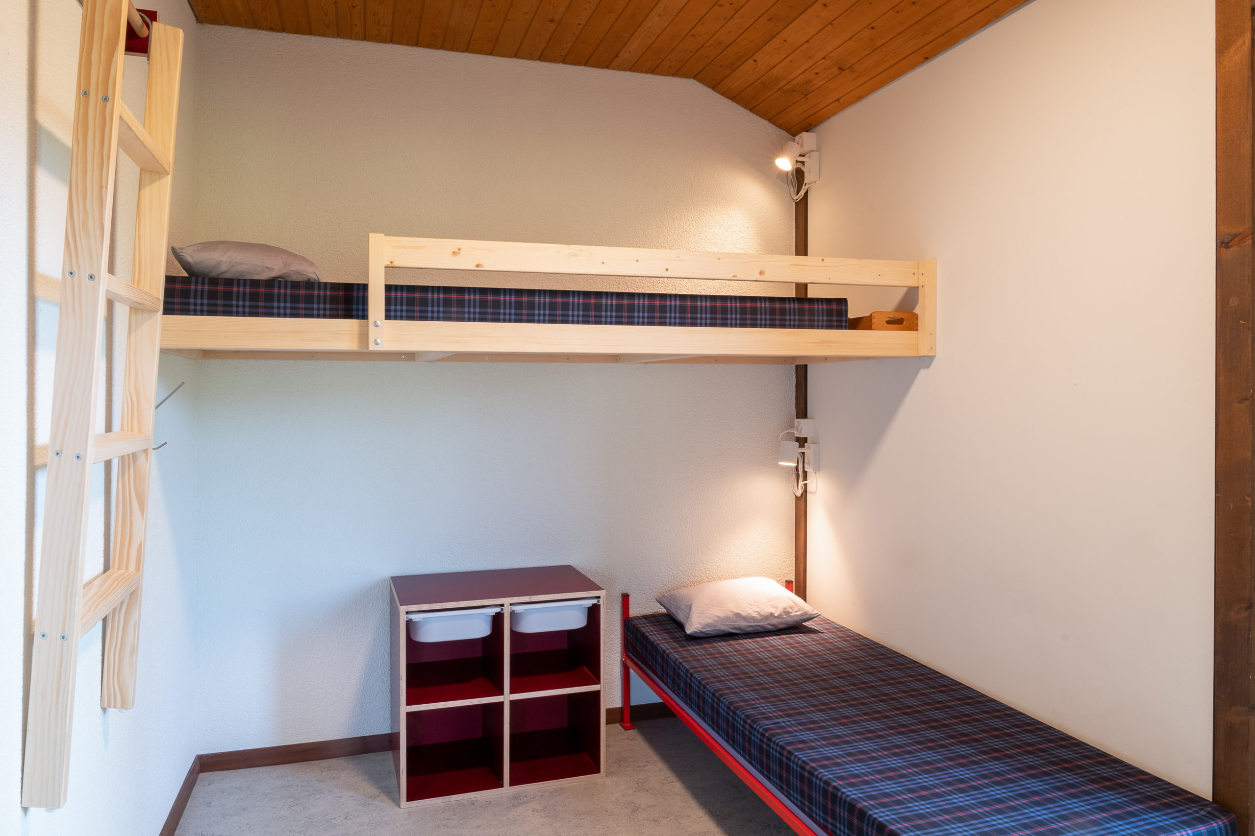 Die Schlafräume im Erdgeschoss sind mit Etagenbetten eingerichtet. Zwei 2er-Zimmer haben einen kleinen Schreibtisch. Im Massenlager sind die Schlafplätze in drei verschieden grosse Gruppen und in drei Einzelplätze aufgeteilt.